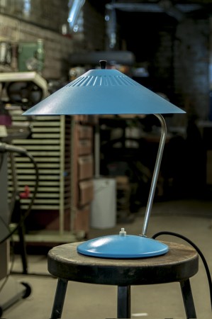 Elegantiškas stalinis šviestuvas. Metalas, tekstilinis laidas. Gaubto skersmuo - 31 cm, aukštis - 36 cm. Restauruotas.