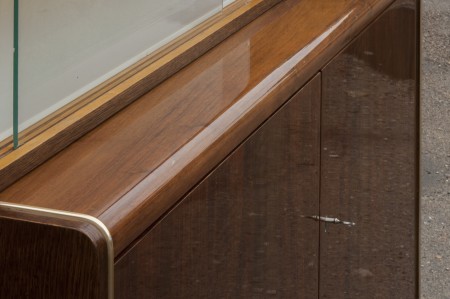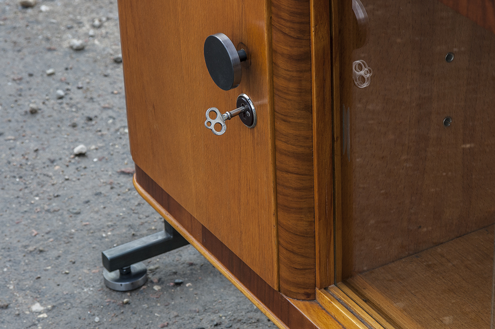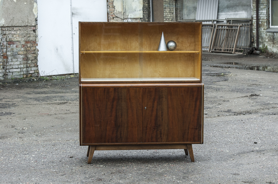 Čekoslovakiška komoda su knygų lentynomis. Riešuto ir ąžuolo lukštas, keramika, stiklas. Dizaineris: Bohumil Lansdman / Gamintojas: Jitona NP / Čekoslovakija, 1969m. Dydžiai: 1180/1360/420. Geros vintažinės būklės.