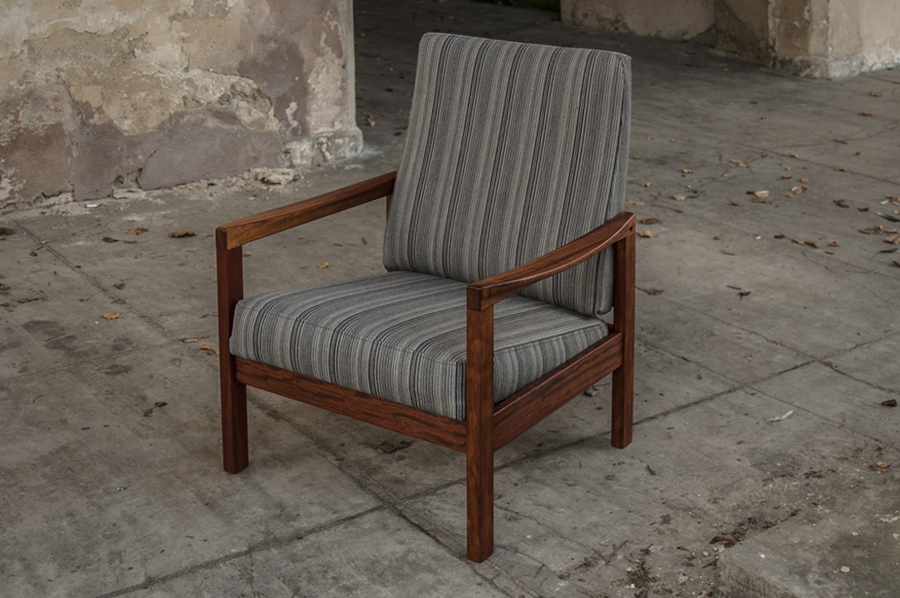 Norvegiškas fotelis. Jo išskirtinumas yra rėmo medienoje - palisandras, gan reta ir brangi medžio rūšis. Ypač kieta ir sunki, naudojama muzikos instrumentų, prabangių aksesuarų ir baldų gamyboje, nupoliruotas medis stebina savo gyliu ir daugiasluoksniškumu. Restauruotas. Nuotrauka pavyzdinio baldo, galima rinktis audinį pagal poreikius. 15 vnt.